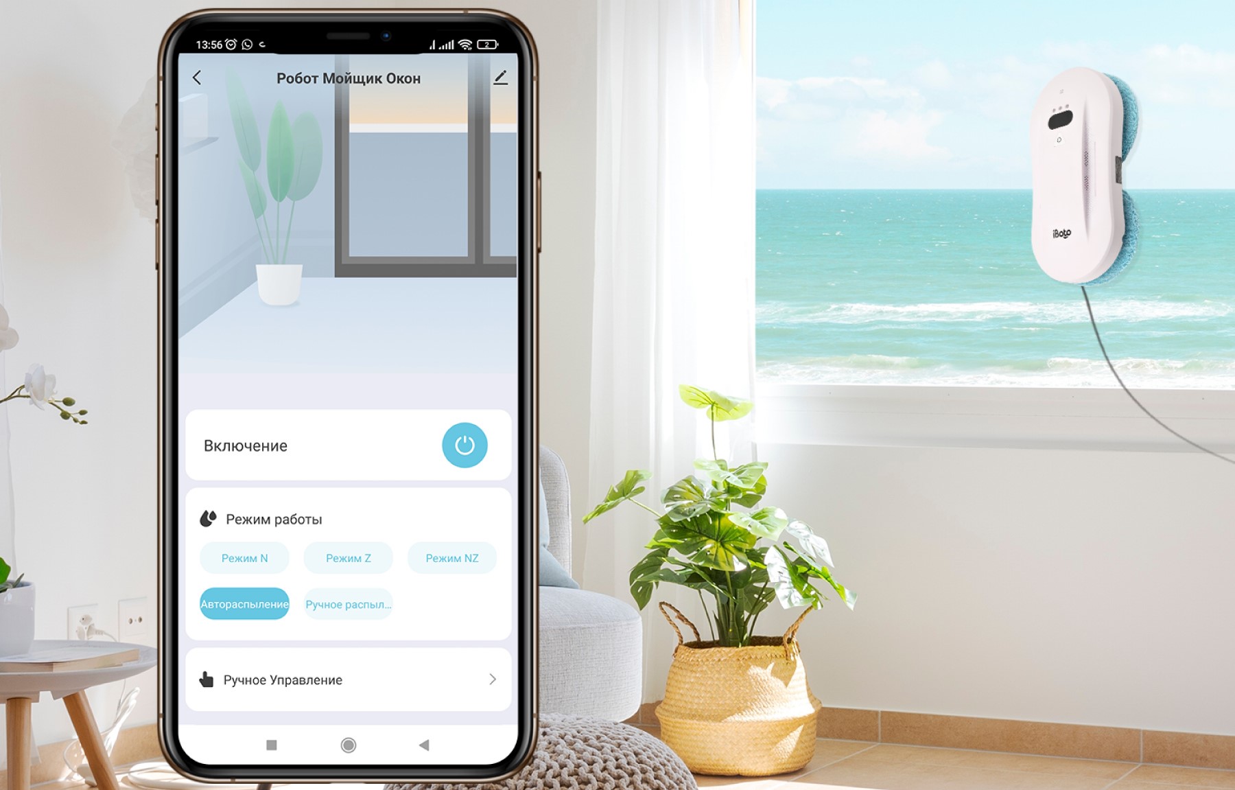 Робот для мытья окон с распылением легко управляется с помощью пульта дистанционного управления или мобильного приложения в фирменном приложении iBoto на русском языке!